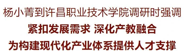 11月3日,市委書記楊小菁到許昌職業(yè)技術(shù)學(xué)院調(diào)研職業(yè)教育發(fā)展情況,強調(diào)要深入學(xué)習貫徹黨的二十屆四中全會精神和習近平總書記關(guān)于教育的重要論述,緊扣發(fā)展需求,深化產(chǎn)教融合,努力培養(yǎng)造就更多高素質(zhì)高技能人才,為構(gòu)建現(xiàn)代化產(chǎn)業(yè)體系提供有力支撐。市委副書記、市委教育工委書記趙軍參加。