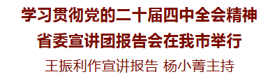 按照省委統(tǒng)一部署,12月1日,學習貫徹黨的二十屆四中全會精神省委宣講團報告會在我市舉行。省委黨的二十屆四中全會精神宣講團成員,省商務廳黨組書記、廳長王振利作宣講報告。市委書記楊小菁主持。市領導張慶一、趙軍、劉保新出席。