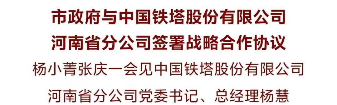 12月4日,市政府與中國鐵塔股份有限公司河南省分公司簽署戰(zhàn)略合作協(xié)議。市委書記楊小菁、市長張慶一會見河南鐵塔黨委書記、總經(jīng)理楊慧,并共同見證簽約。