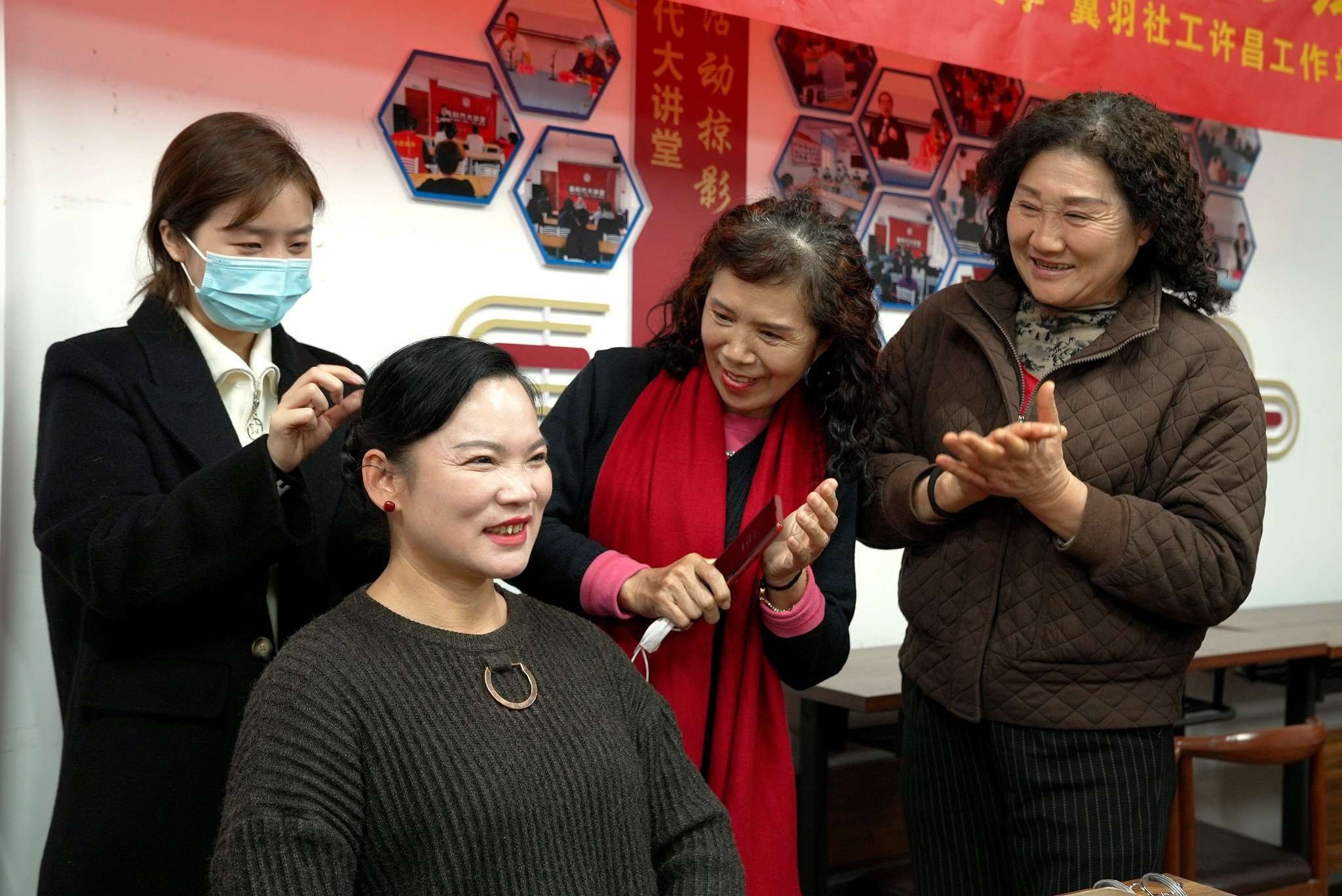 “阿姨,您平常自己涂粉底的時候,發(fā)際線部位別涂得太厚,否則妝容太假……”12月13日,魏都區(qū)文峰街道河西社區(qū)黨群服務(wù)中心二樓的大廳里,專業(yè)化妝師員靜左手拿著粉底膏,右手舉著粉擦,一邊給55歲的社區(qū)居民劉艷麗涂粉底,一邊講解化妝知識。